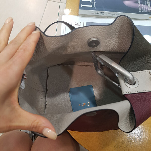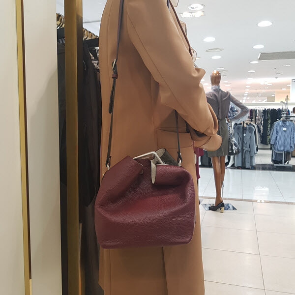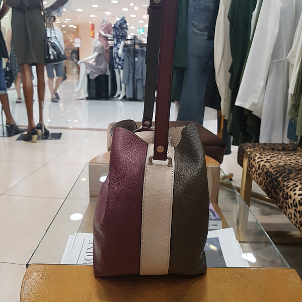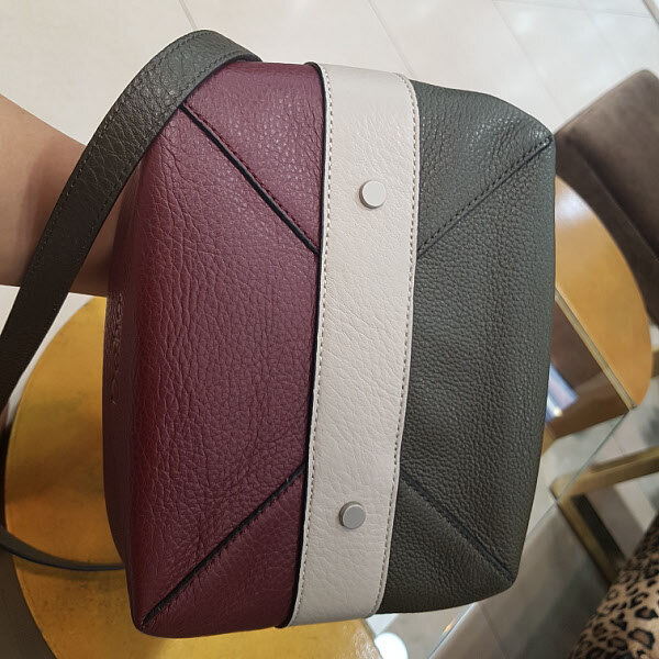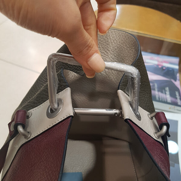 컬러로 배색이 들어간 백으로 가죽이 부드러우며 무게가 가벼워서 간편하게 들기에 아주 좋은 디자인입니다. 장식이 손잡이로도 활용할수있는 스타일입니다.