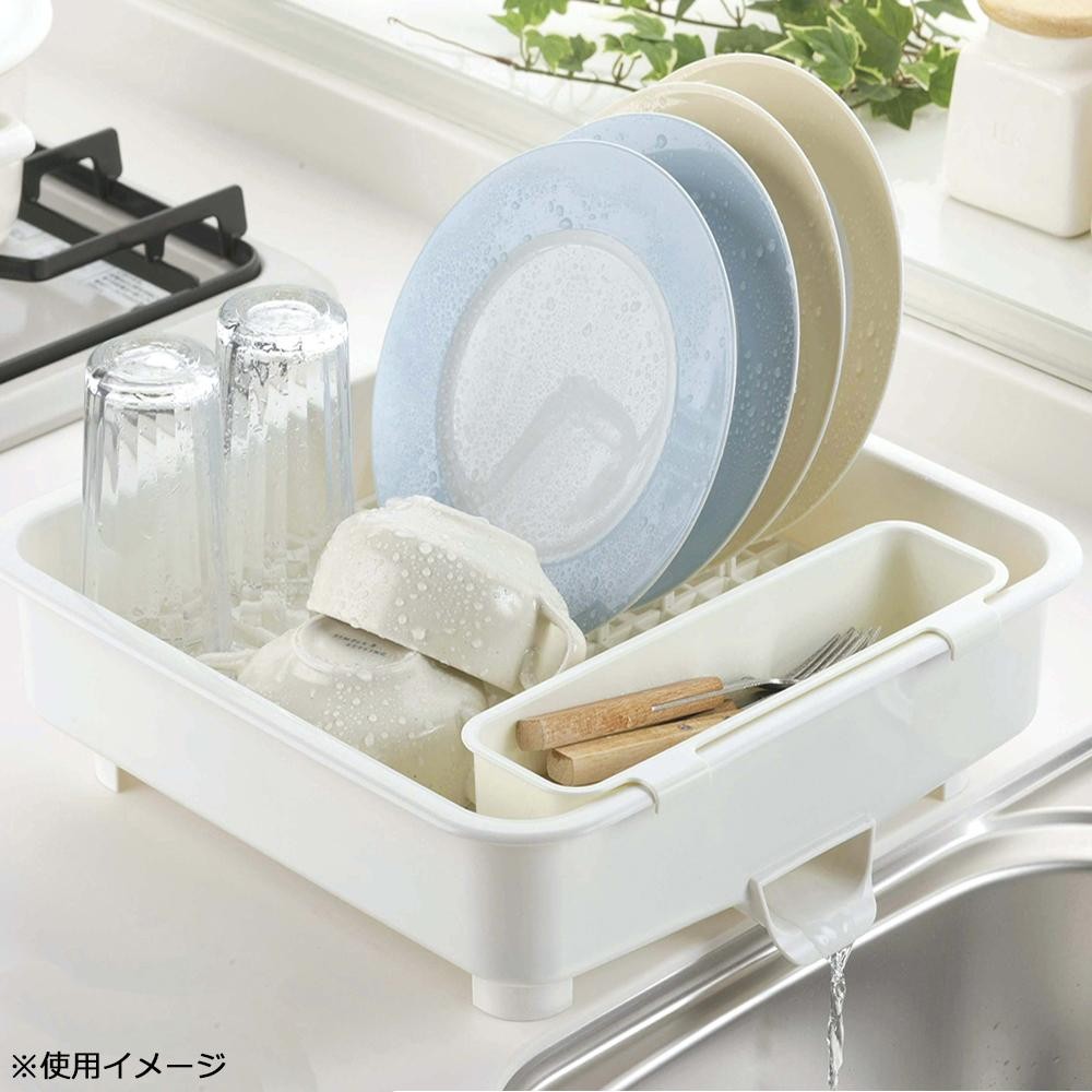 少量の洗い物にピッタリな、コンパクトな水切りカゴです。トレーにたまった水が、横からシンクに排水できます。