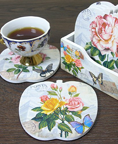 Flower Coasters for Drinks - Set of 6 Wood Coasters with Holder - Vintage Rose Design - Kitchen Decor