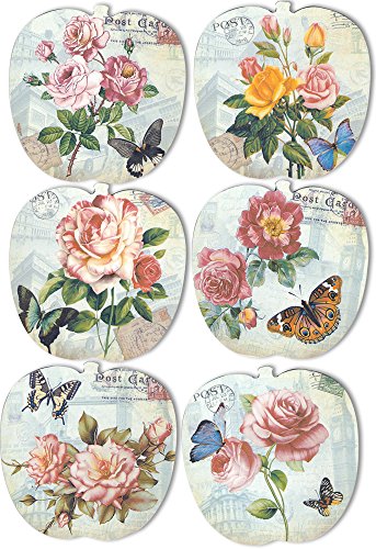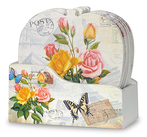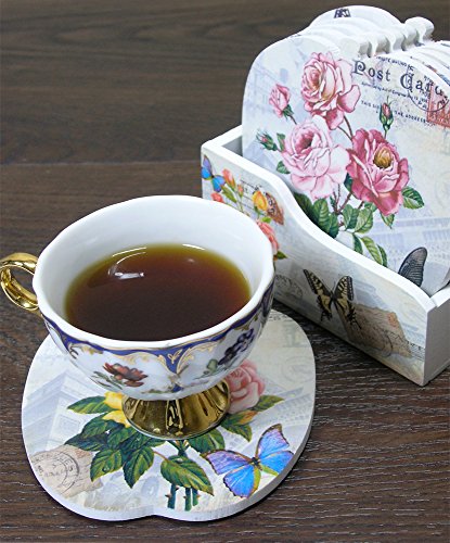 - SET of 6 DECORATIVE COASTER SET WITH HOLDER each coaster has a unique butterfly, flower & vintage post card themed design.