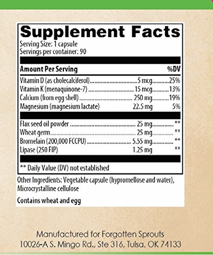 Ingredients: Vitamin D (as cholecalciferol), Vitamin K (menaquinone-7), Calcium (from egg shell), Magnesium (magnesium lactate), Flax seed oil powder, Wheat germ, Bromelain, Lipase, Vegetable capsule (hypromellose and water), Microcrystalline cellulose.