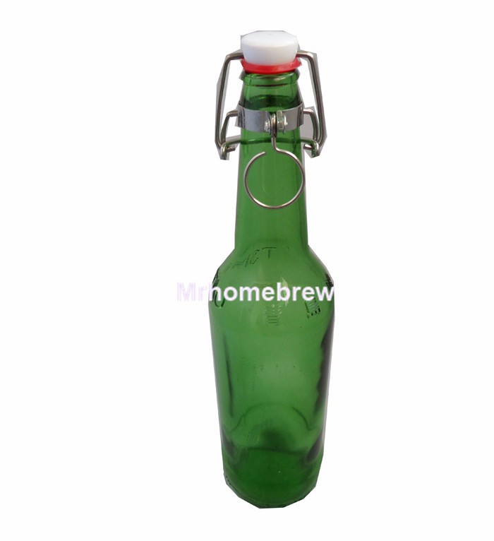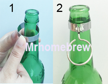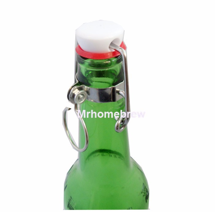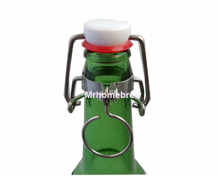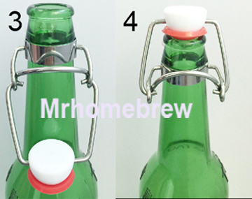 To put on bottle have bail lever on one side of neck and the swing cap on the other. Put one wire prong in one hole and slide the other prong along the glass towards the other hole until it clicks.