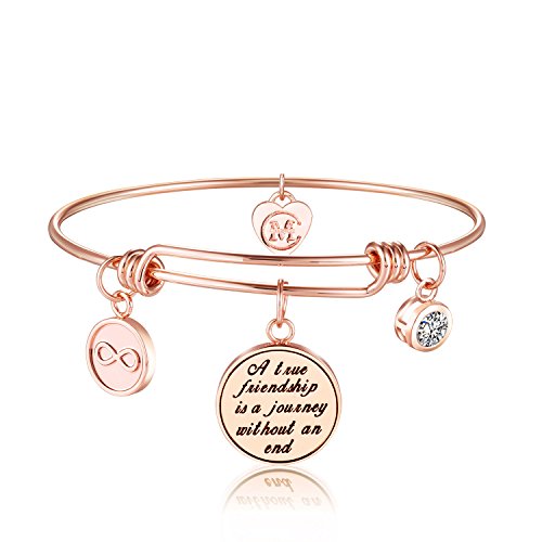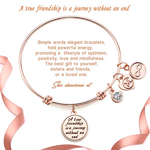 -. Feature : WARM and LOVE MESSAGE ON CHARM:"A true friendship is a journey without an end." No matter where you are, the real friendship will never disappear with time. When you feel lonely and miss your friends or family people, just read the inscribed words on it and gain the motivation to continue your day. Great gift for family and friends to cherish loved ones. / AMAZING DESIGN: This expandable wire bangle bracelet featuring engraved message dangle charm design adorned with a engraved charm and three stamped charms. Simple but special. Fits for any occasions and adds compliment to any outfits. / PREMIUM QUALITY: 24K Platinum-Plated over hypoallergenic and nickel-free brass. No harm to health. / PERFECT FIT: The Wire Bangle is so chic and minimalist. Set with a macrame' closure. It will fit most size wrist and you can make it as tight or loose as you like. It adjust from 2.5" to 2.95" in diameter, wire is 1.8mm thick. / PERFECT GIFT CHOICE: Wrapped in a classic jewelry gift box, a thoughtful present for her, best friends, girls, teen girls,sisters or yourself on Birthday, Anniversary, Mother's Day, Sweetest Day, Halloween, Thanksgiving, Christmas, Valentines Day, or just send as a surP.R.Ise gift for that special one in your life to let her know you care about her.