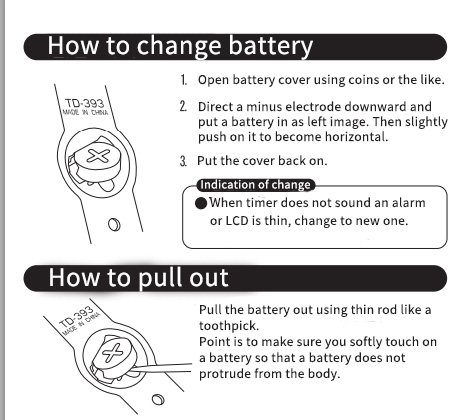-. Feature : Wide LCD High Visibility Kitchen Timer / Easy And Handy Settings By Rotating Dial / With Repeat And Count Up Functions / Simple And Smart / LR44 Alkaline Button Cell Battery Included