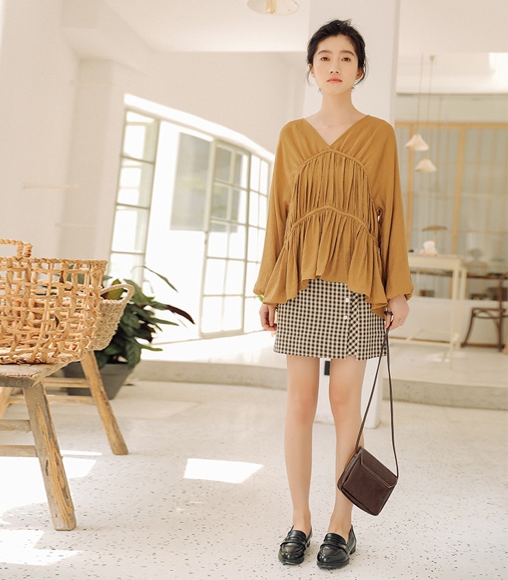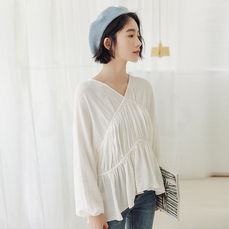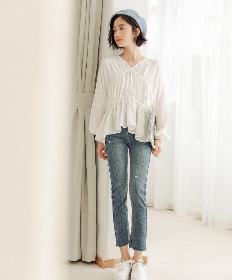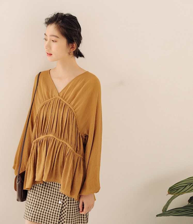 Vネックタイプで顔周りをすっきりと見せてくれるので大人女子にぴったり◎