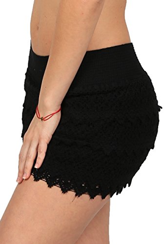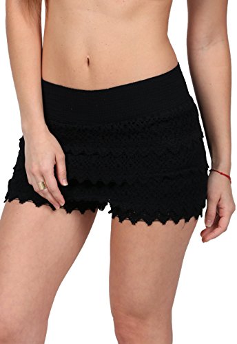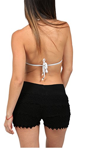 -. Feature : Knit crochet shorts with tiered scalloped lace. / Comfort stretch waist sits on hip. / Plus size available. Machine wash cold water, do not use bleach, air dry iron. / Model Measurements: Waist 22" | hip 34" | Thigh: 20" | Inseam: 20" | Height: 12" | Wears size small / Made of 100% Pima Cotton made in Peru.