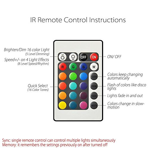 - EASY REMOTE CONTROL - use the credit-card sized remote to choose 16 static RGB color light (red, green, blue, pink, purple, yellow, white, etc) plus 5-level dimming and 4 cool light transition effects plus rhythm/speed control