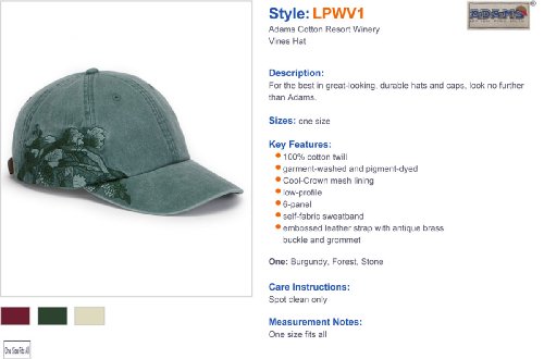 Studio : Adams Cap Publisher : Adams Cap Product Description LPWV1 Adams Cotton Resort Winery Vines Hat For the best in great-looking, durable hats and caps, look no further than Adams. 100% cotton twill garment-washed and pigment-dyed Cool-Crownmesh lining low-profile 6-panel self-fabric sweatband embossed leather strap with antique brass buckle and grommet matching sewn eyelets tonal embroidery on right side panel 4"w x 2"h imprint area Sizes: one size 0