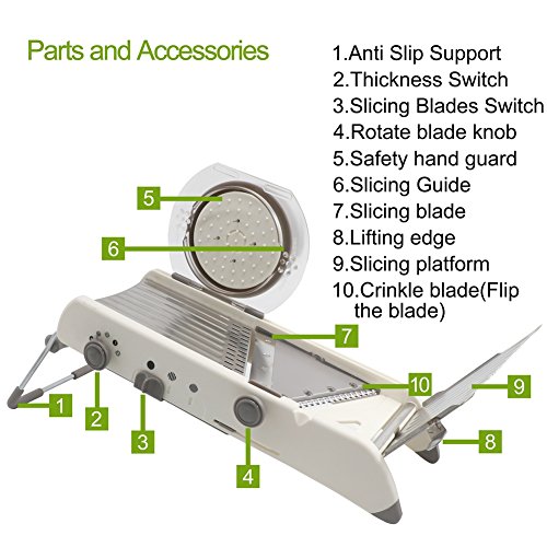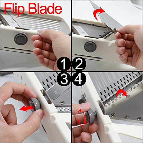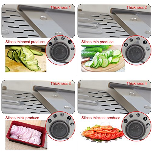 - ADJUSTABLE BLADE: It included 4 adjustable slicing thicknesses, 2 julienne (thin and wide) and 1 waffle cutting option, The blade adjustment knob provides seamless change between the Integrated blades, eliminating loose parts.