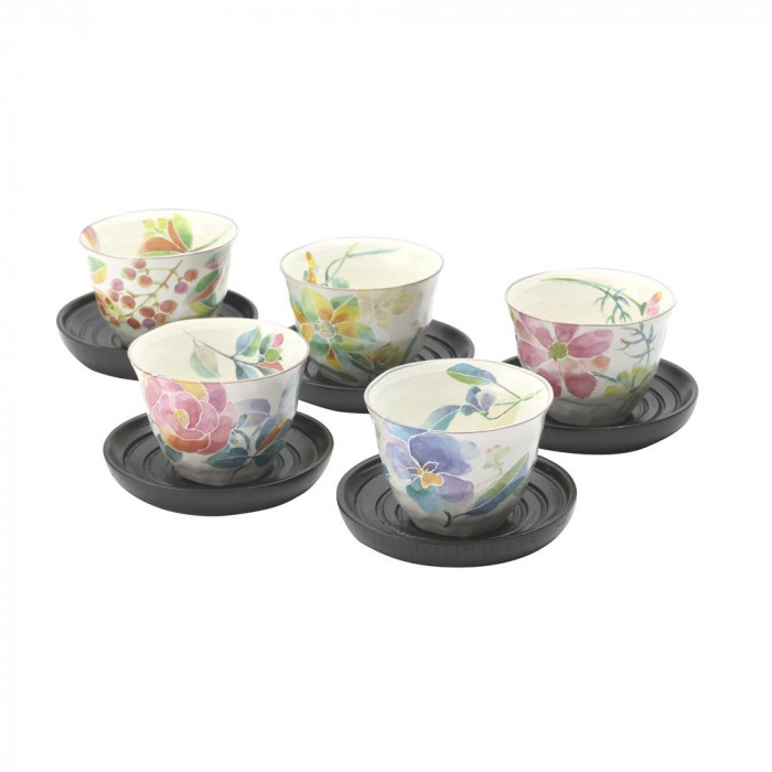 淡い花柄が上品な茶托付煎茶です。煎茶碗と茶托の5客セットです。