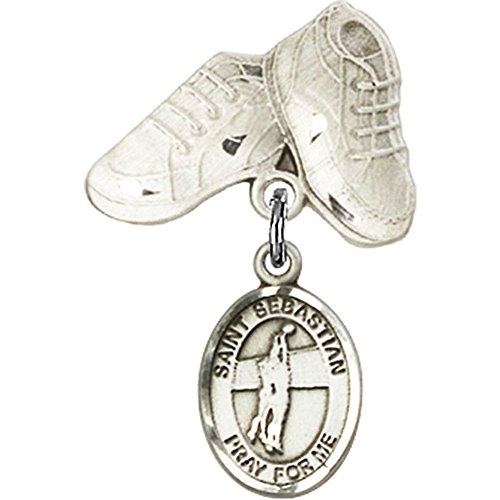 -. Title : Sterling Silver Baby Badge with St. Sebastian / Volleyball Charm and Baby Boots Pin 1 X 5/8 inches