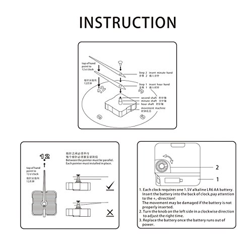 -. Feature : 100% New and Fashion; Material: Aluminum clock pointer / Hour hand length: 23.5cm ; Minute hand length: 31.5cm ; Clock machine face: 10.4cm / Package: 2pcs clock hands+1x clock Movement (NO battery) / Please note: Because this item only one minute hand and one hour hand,after put the battery in,it must take 5 minute to test the clock move or not.hope you understand.Thank you / 100% new product ,clock surface have a protective film,Please tear off after installation.Note :Please don't install the hour pointer and minute pointer very tight,if not ,that will cause the clock does't move.