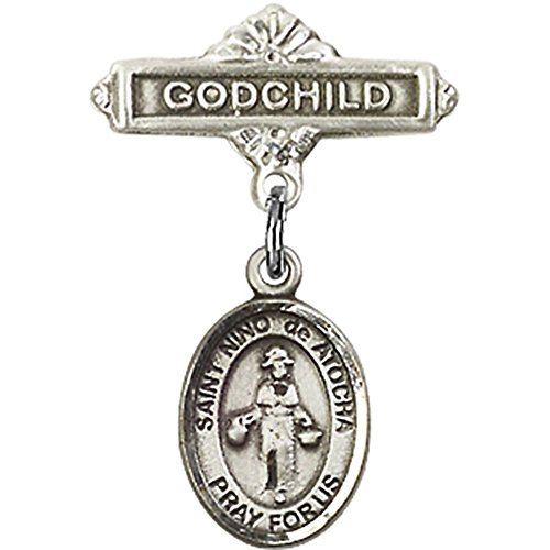 -. Title : Sterling Silver Baby Badge with St. Nino de Atocha Charm and Godchild Badge Pin 1 X 5/8 inches