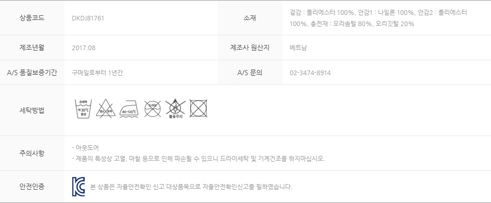 *고급 덕다운을 충전재로 사용하여 보온성과 내구성 강화
