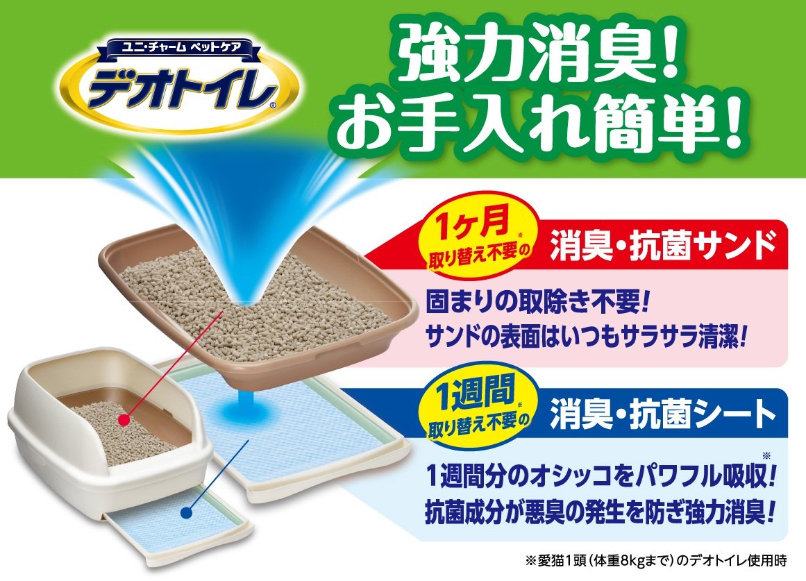 ・お手入れカンタン。閉めきったお部屋でもニオわない、猫用のシステムトイレ・約1ヶ月交換不要※の消臭サンドはオシッコをサッと下層に通過させ、オシッコが固まらないので、取り除きがいらずお手入れカンタン※愛猫1頭(体重8kgまで)のデオトイレ使用時・猫ちゃんが砂かきするたび香りのカプセルがはじけて香りが発生、しっかり消臭、香り長続き。
