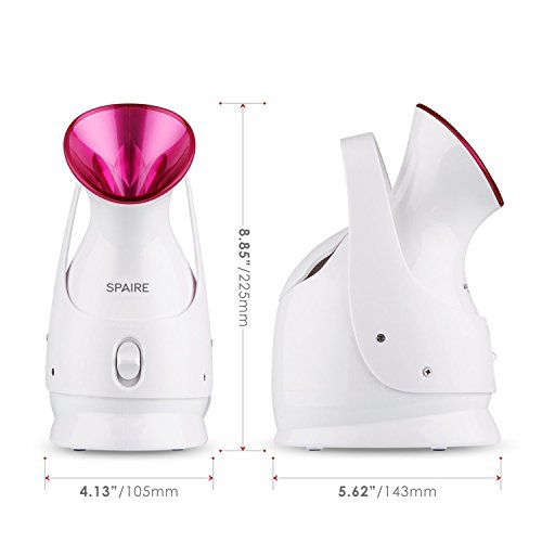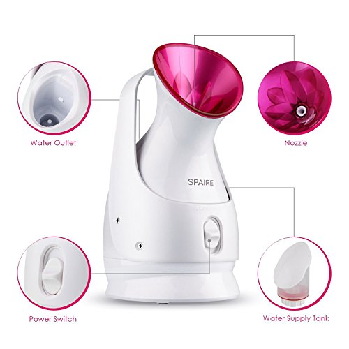 -. Feature : NANO-ATOMIZATION TECHNOLOGY: The facial steamer can produce nano steam with ionic water particles which can penetrate your skin 10X easier than regular face steamers do to offer the basis for facial treatment. A tepid and gentle temperature of the steamer can unclog pores, remove dirt, oil, keratin and leftovers of makeup, promote blood circulation / MUTIFUNCTIONAL: It is 2 in1 device since it not only can be used as a facial steamer , but also it can act as hot mist humidifier for a room / SAFE AND CONVIENENT: The constant temperature control technology allow it to spray steam in constant temperature and uniform speed, the steam begins to spray only after the steamer is opened for about 40 seconds to save your time effectively. / HUMANIZED DESIGN: You can turn off or turn on the steamer through an on / off switch, with the separate 85ML water tank, it is easier to add water. I is also portable and easy to carry. With non-slip pads on the bottom, They can help the steamer to stand more firmly on the table / PACKAGE CONTENTS: 1 x Spaire Nano Ion facial Steamer; 1 x User Manual; 1 x Warranty Card; Spaire offers you a guarantee of 24 months