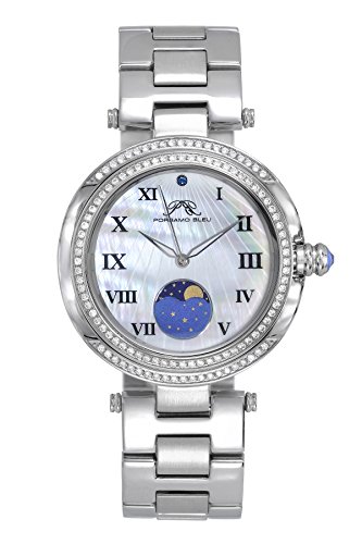 Porsamo Bleu South Sea Crystal Moon Ladies' watch with dazzling crystals inlaid in bezel, stainless steel case and bracelet, carved mother of pearl dial with moon phase sub-dial and blue Swarovski® crystal at 12 o'clock & push in crown with blue Swarovski® crystal; Silver tone
