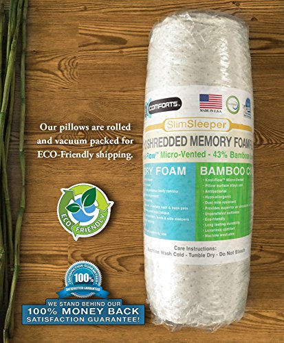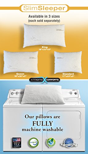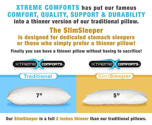 - Feature : SLIM DESIGN - A thinner version of our traditional pillow. FOR STOMACH SLEEPERS or those who simply prefer a thinner pillow! MADE IN THE USA with 100% U.S. Made CertiPur-US Certified Foam - Our Extra Breathable Micro-Vented Kool-Flow™ Technology Cover That Is Combined With 43% Bamboo Allows Greater Ventilation and Helps Keep You Cool All Night Long For the Best Sleep Ever! / PROPRIETARY SHREDDED MEMORY FOAM - Guaranteed to Never go Flat and is Machine Washable! Xtreme Comforts Pillows Are Built For Comfort, Support, and Durability! HYPOALLERGENIC - With Our Premium Quality Pillows, Allergy Sufferers No Longer Need to Compromise Comfort! Our Bed Pillows are Sold Only on Amazon. They are Rolled and Vacuum Sealed at the Factory For Frustration Free Eco-Friendly Shipping.Pillows. They Are Machine Washable and Built For Comfort, Support, and Durability!! / PROVIDES RELIEF - from several sleeping issues, including snoring, insomnia, migraines, neck and back pain, allergies, and TMJ. Great for stomach, side and back sleepers. We are Sure that You Will Agree that it is a 5 Star Hotel Quality Pillow. Customers Have Said "it's Like Sleeping on a Cloud , I Love My Pillow!" / SUPERIOR DURABILITY, COMFORT, QUALITY, & SUPPORT - Your Pillow Will Never Go Flat! You Can Custom Mold Your Pillow So That it is Comfortable For ALL Sleep Positions. Orthopedically Promotes Proper Neck and Back Alignment to Reduce Tossing and Turning For Back, Stomach and Side Sleepers! So comfortable you will be telling your family members to let go of my pillow. / BACKED BY XTREME COMFORTS - NO Questions Asked Money Back Guarantee. If you aren't 100% satisfied, simply return it within 30 days! Best in the Business 6 year Warranty!