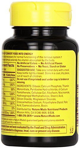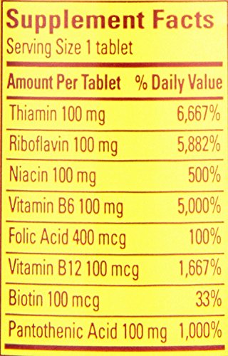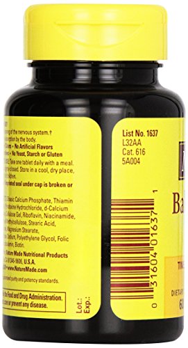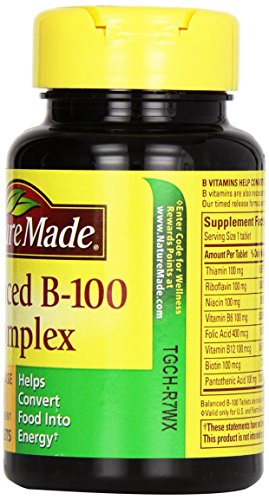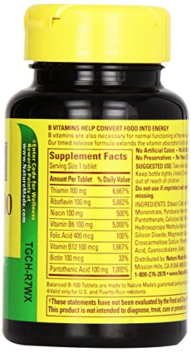 Nature Made Balanced B-100 TR 60-count. Nature Made Vitamin B-100, 60 ct. Recommended as part of daily regimen for health, longevity, mood, and energy. Combination of essential B vitamins such as thiamin, riboflavin, niacin, vitamin B-6, and vitamin B-12; contains 1667% RDA of Vitamin B-12; 5000% of B-6; and 6667% of thiamin per tablet serving. Time-release formula releases nutrients to body over extended periodFeature