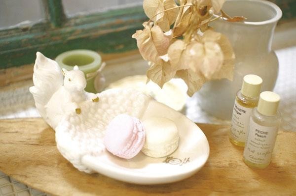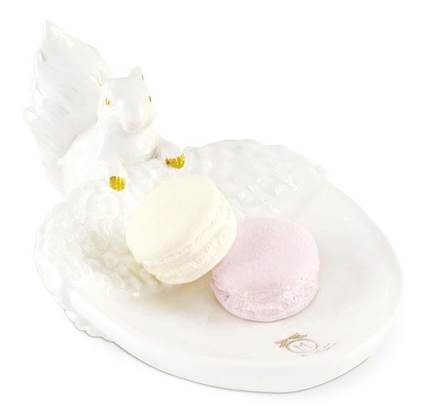 | 見ているだけで楽しくなりそうなリスが遊ぶ磁器トレイに、とってもスイートなマカロンのアロマストーンがちょこんと乗っています。お好みのアロマオイルを垂らしてお楽しみください♪ |