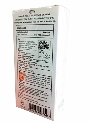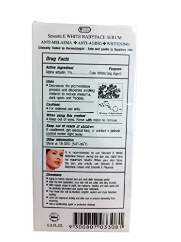 -. Binding : Misc. -. Brand : Smooth E -. EAN : 0801781886025 -. Feature : 2 packs of Smooth E white babyface serum, Anti-melasma + Anti-aging + whitening, clinically tested by dermatologist: safe and gentle to sensitive skin. (0.8 FLOZ./ pack) / active ingredient: Alpha arbutin 1% ....... Skin whitening agent / Uses: decreases the pigmention process and disperse existing melanin to reduce melasma. Dark spots and freckles. / Direction: 1.apply to freshly cleaned face and neck daily. massage gently. 2.after the first application, your skin will feel softer and silky smooth. 3.with regular usage at night. the melasma. freckles and darkspots will be gradually eliminated and appear less noticeable. 4.your facial skin will be flawless, brighter, radiant and more babyface looking. 5. limit sun exposure during and after use to prevent darkening from recurring. 6.use a sunblocking agent or protective clothing. / free!! Tracking number and sticker Thai_product, souvenir from Thai_product., High Quality & Services by Thai_product. -. Label : Thailand -. Manufacturer : Thailand -. ProductGroup : Beauty -. ProductTypeName : BEAUTY -. Publisher : Thailand -. Studio : Thailand -. Title : 2 packs of Smooth E White Babyface Serum, Anti-melasma + Anti-aging + Whitening, Clinically Tested By Dermatologist: Safe and Gentle to Sensitive Skin. (0.8 Floz./ Pack) -. UPC : 801781886025