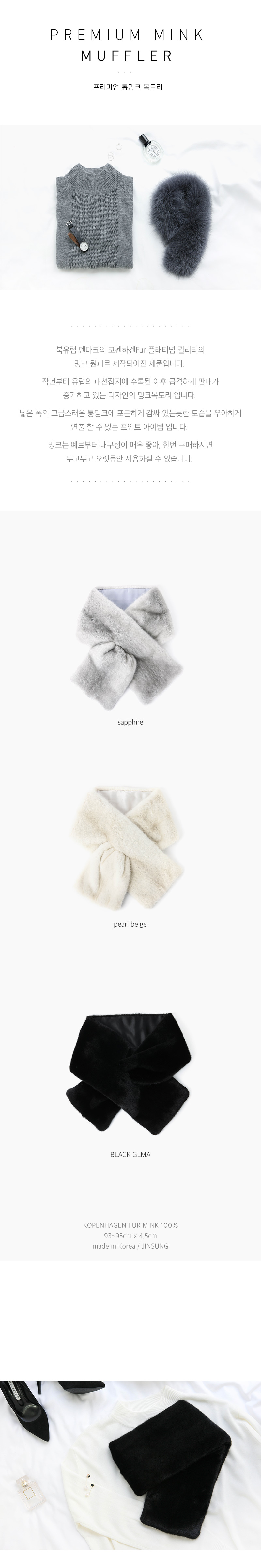 넓은 폭의 고급스러운 통밍크에 포근하게 감쌓있는듯한 모습을 우아하게 연출 할 수 있는 포인트 아이템 입니다.
