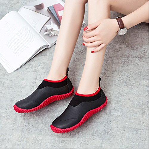 Rain Boots Features: - Style: Winter Anti-skid Rain Boots - Uppers Material: Neoprene Uppers - Inner Material: Synthetic Textile - Outsole Material: Rubber - Material Composition: Rubber/Fabric - Closure: Slip On - Features: Waterproof, non-slip,convenience to wear - Color: Black,Black Red,Black Green.