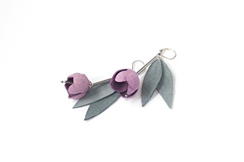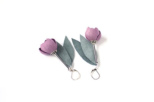 -. Title : Leather earrings with Pink rose flowers and grey green leaves. Leather floral jewelry
