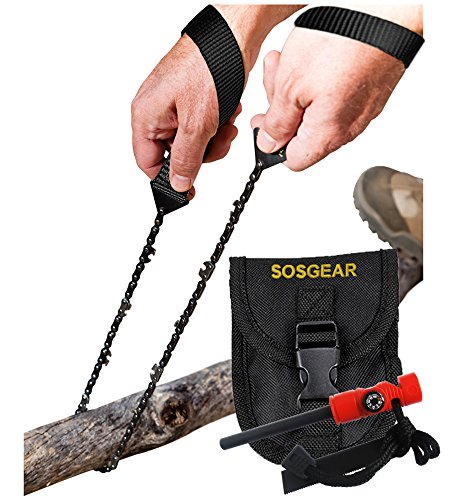 SOS Gear Pocket Chainsaw and Fire Starter - Survival Kit with Hand Saw in Embroidered Pouch, Firestarter with Built in Compass & Whistle for Camping & Backpacking - Black Straps 24 or 36 inch Chain