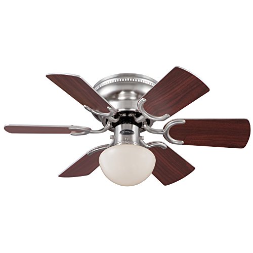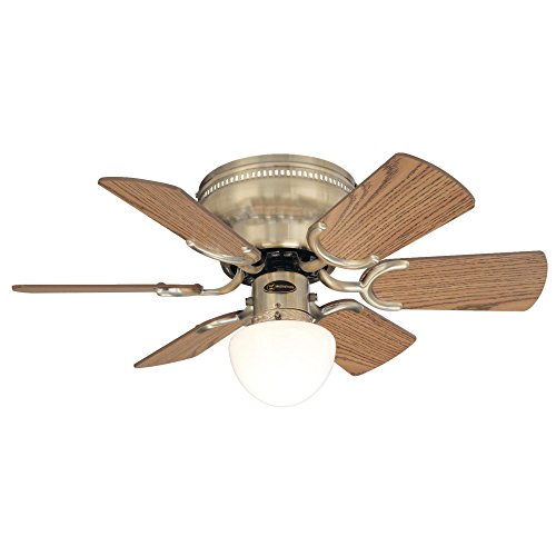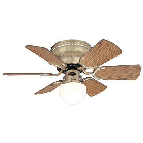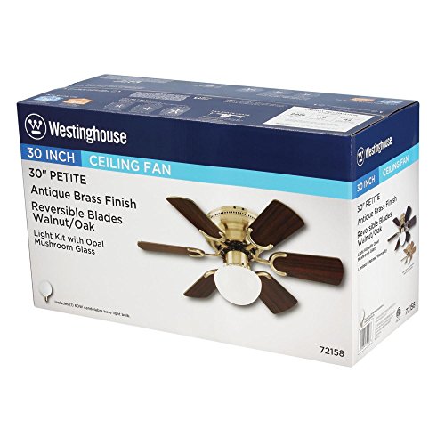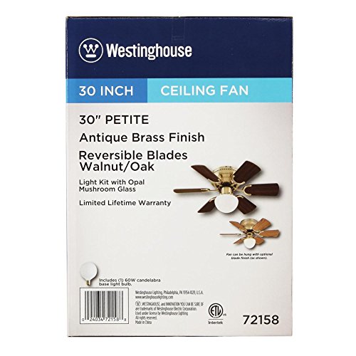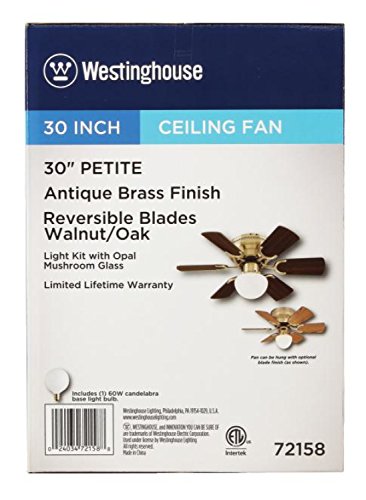 Enjoy classic style and year-round comfort in any small room with the petite indoor Fan. The antique brass finish provides a vintage look. Reversible blades in complementary finishes give you options for matching your room's decor. Choose from Walnut or oak wood finish blades. The one-light Opal glass light kit adds a charming touch and lovely illumination. The fan's hugger mount style is perfect for rooms with low ceilings, from a small kitchen to a child's bedroom. This Fan offers big power in a petite package and includes a candelabra base, 60-watt G16-1/2 light bulb. This Westinghouse ceiling Fan is backed by a lifetime motor warranty and a two-year warranty on all other parts. Westinghouse is a trusted, global brand. Westinghouse knows lighting and offers products with exceptional quality, reliability and functionality. Product reference number 72158.Feature