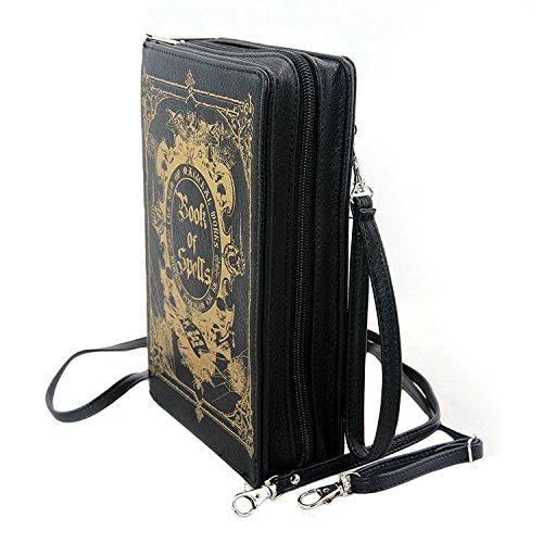 -. Brand : WonderMolly -. ClothingSize : One Size -. Department : womens -. Feature : Measures Approx: 6" (L) x 2.25" (W) x 9.25" (H) / Includes 23" maximum detachable strap drop and 6" wristlet strap / Zip around closure / Fabric lined interior with 1 zippered compartment / Quality vinyl material and uniquely designed -. ProductGroup : Shoes -. ProductTypeName : HANDBAG -. Size : One Size -. Title : Book of Spells Clutch Bag in Vinyl Material