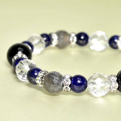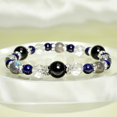 | 夢や希望に向かうあなたを 成功へと導くブレスレット 天然石の中でも、十字の星が出るものはあまりありません・・・ ダイオプサイトの中でも黒く、光を当て “十字の星” が浮かぶものは 通称≪ブラックスター≫と呼ばれています。 シルバーアクセ等に使われる石として、人気の高い天然石ですが、 何故か流通量は少ない石ですが、非常に魅力的な美しさと、 強いエネルギーを持つ石です。 悪いエネルギーから持ち主を守るとともに、エネルギー自体も強化します。 また、自尊心と他人を信頼する心を高めるといわれているので、 リーダー的なポジションにいる人にオススメの石です。 そして、すべてに幸運をもたらすとされるラブラドライト。 怒りや悲しみを、喜びに変えてくれたり、持ち主の夢や希望を叶える オールマイティーな石といわれています。 心を落ち着かせてイマジネーション(想像力)を高め、 潜在能力を引き出しひらめきを与えてくれると伝承され愛されてきました。 ラピスラズリは邪気を退けるパワーをもち、外部からの邪気と自身の 心の邪念も退けるといわれます。 さまざまなパワーをもつとされるラピスラズリですが、 最高の幸運を呼び寄せるお守りとして、多くの方が大切にされています。 水晶は、古来より世界中で特別なパワーを持った石として 伝わってきました。浄化・守護を司り、また、あらゆることに万能な |