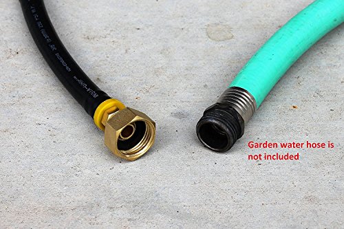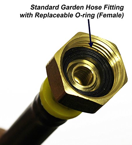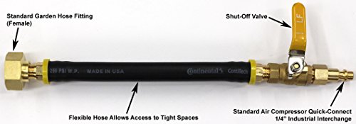 - Flexible hose allows the adapter to access tight spaces and minimizes stress on pipes and fittings. 100% outdoor rated, virtually indestructible, impervious to water and oil. Easily connects to air compressor and garden faucet to winterize lawn sprinkler systems, faucets, and plumbing to prevent damage due to freezing. Compatible with standard garden hose threading and air compressor quick-connect commonly found in North America.