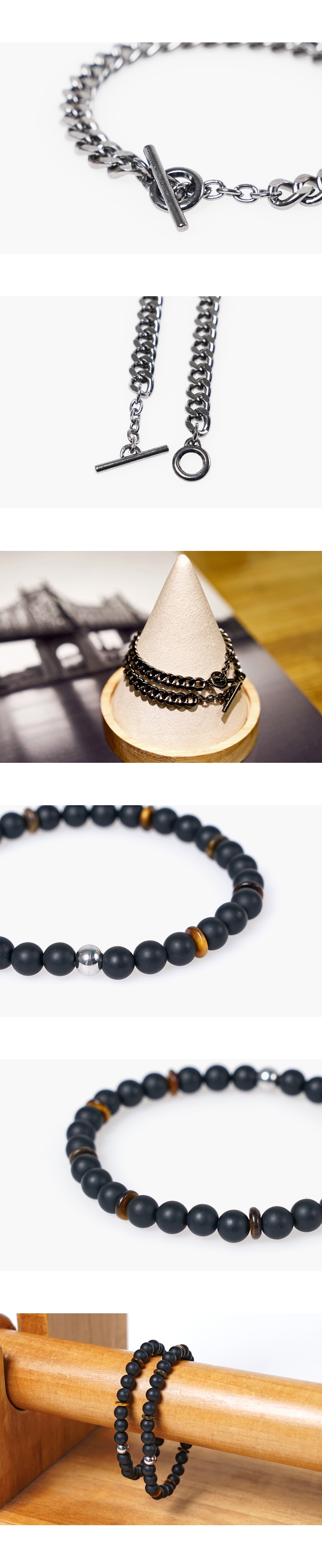 6mm무광 오닉스와 원반형 타이거아이즈를 이용해 제작된 원석팔찌와 가볍게 착용하기 좋은 슬림한 디자인의 체인팔찌로 이루어진 팔찌세트입니다. 블랙과 옐로우톤의 호안석이 클래식한 느낌으로 잘 어우러집니다. 모던룩이나, 클래식룩에 매치하면 잘 어울립니다. 체인팔찌는 부담없는 크기의 체인으로 남녀 모두 가볍게 착용하기 좋으며, 톤다운된 흑니켈 컬러로 튀지않아 은은하게 착용하기 좋습니다. 댄디한 코디에 심플하게 포인트로 착용하거나, 가죽이나 원석으로 만들어진 팔찌와 함께 착용해도 좋습니다. 사이즈는 남성용, 여성용, 주문제작이 가능하며, 주문제작시 요청하시는 사이즈에 맞춰 팔찌 사이즈를 맞춰드리고 추가비용은 없습니다.