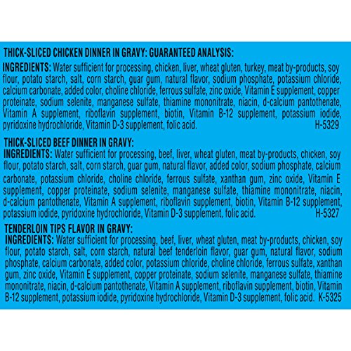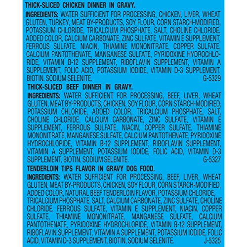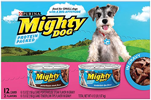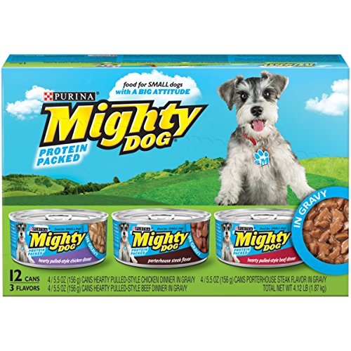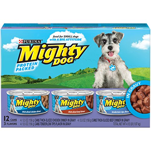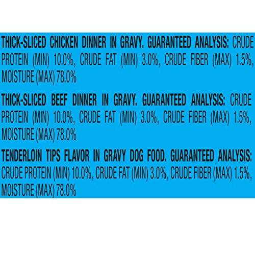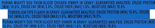Guaranteed Analysis Purina Mighty Dog Thick-Sliced Chicken Dinner in Gravy: Crude Protein (Min)...9.0%, Crude Fat (Min)...3.5%, Crude Fiber (Max)...1.5%, Moisture (Max)...80.0%. Purina Mighty Dog Thick-Sliced Beef Dinner in Gravy: Crude Protein (Min)...9.0%, Crude Fat (Min)...3.5%, Crude Fiber (Max)...1.5%, Moisture (Max)...80.0%. Purina Mighty Dog Tenderloin Tips Flavor in Gravy: Crude Protein (Min)...9.0%, Crude Fat (Min)...3.5%, Crude Fiber (Max)...1.5%, Moisture (Max)...80.0%.