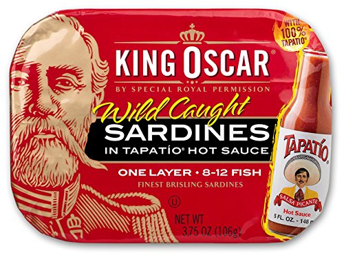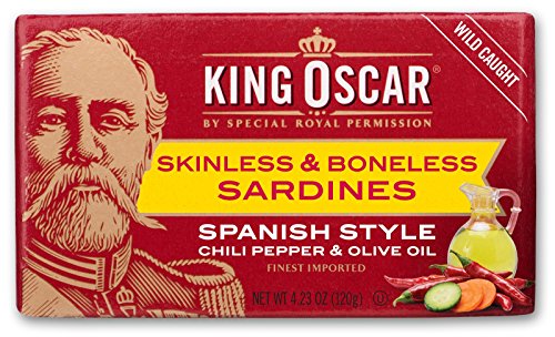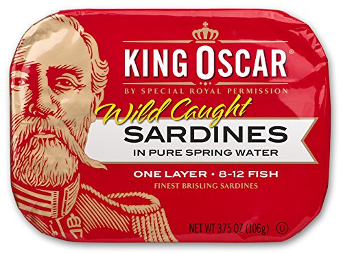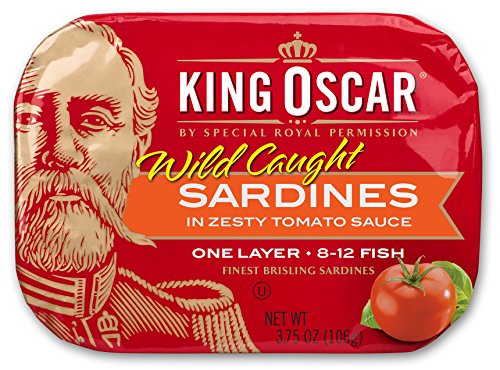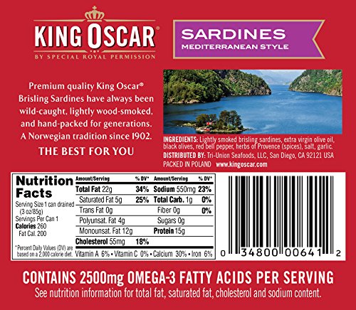 Flavor: Mediterranean Style, 1-Layer, 8-12 fish per can, 3.75 oz Finest quality, tiny, sustainably wild-caught Norwegian brisling sardines in a Mediterranean-style sauce of top-grade extra virgin olive oil, sliced black olives, red bell pepper, garlic, and herbs of Provence. 8-12 fish per can. Authentically oak wood-smoked for mild flavor and always hand-packed. A ready-to-eat, low-carb, simple superfood – and a King Oscar original. Non-GMO. Gluten-free. No sugars added. Kosher-certified (OU). Certified BPA-NI cans.Feature