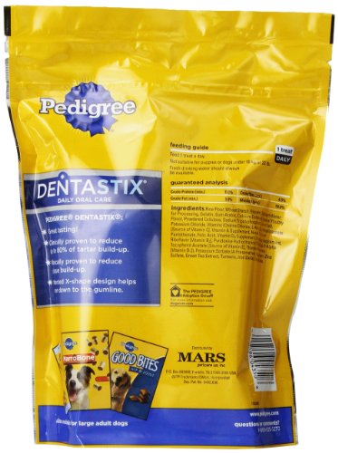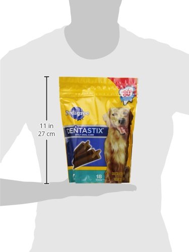 -. Binding : Grocery -. Brand : Pedigree -. Color : Other -. EAN : 0058496043506 -. Feature : Contains (1) 18-count pack of PEDIGREE DENTASTIX Original Large Treats for Dogs / PEDIGREE DENTASTIX Triple Action: Reduces tartar buildup, cleans teeth and freshens breath / Our dental sticks have an X-shape design and are specially designed for adult large breed dogs / Feed one PEDIGREE DENTASTIX Oral Care Treat every day for maximum benefits / Dogs love the tasty original flavor of PEDIGREE DENTASTIX Oral Care Treats -. Label : Dentastix -. Manufacturer : Dentastix -. Model : E0435004 -. MPN : E0435004 -. NumberOfItems : 1 -. PackageQuantity : 1 -. PartNumber : E0435004 -. ProductGroup : Pet Products -. ProductTypeName : PET_SUPPLIES -. PublicationDate : 2012-04-26 -. Publisher : Dentastix -. Size : 15.6 oz -. Studio : Dentastix -. Title : PEDIGREE DENTASTIX Original Large Treats for Dogs - 15.6 oz. 18 Count -. UPC : 058496043506