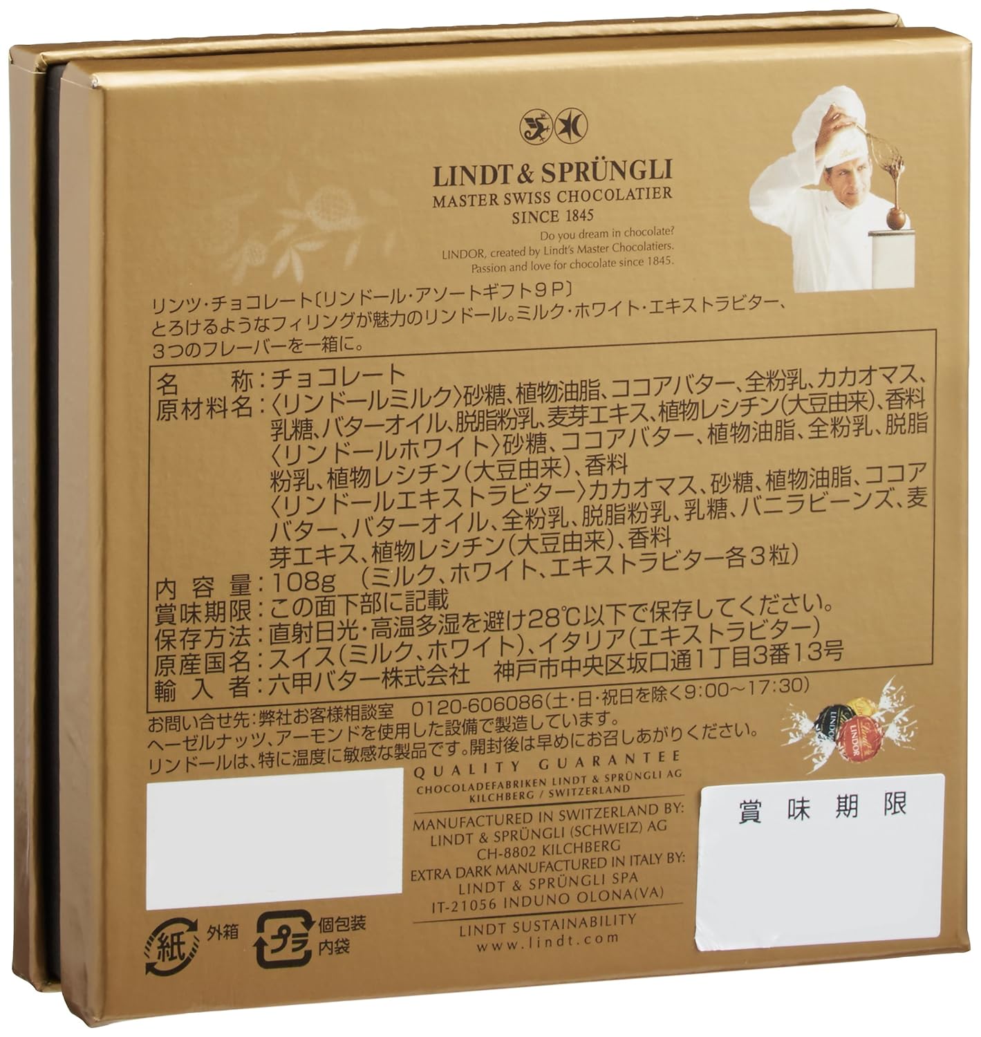 原材料:〈リンドールミルク〉砂糖、植物油脂、ココアバター、全粉乳、カカオマス、乳糖、バターオイル、脱脂粉乳、麦芽エキス、植物レシチン(大豆由来)、香料〈リンドールホワイト〉砂糖、ココアバター、植物油脂、全粉乳、脱脂粉乳、植物レシチン(大豆由来)、香料〈リンドールエキストラビター〉カカオマス、砂糖、植物油脂、ココアバター、バターオイル、全粉乳、脱脂粉乳、乳糖、バニラビーンズ、麦芽エキス、植物レシチン(大豆由来)、香料