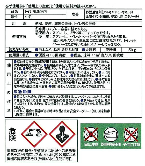fk094igrjsニオイの元となる菌を退治します。便器だけでなく鏡、洗面台などトイレ全体の洗浄に使えるので毎日のトイレ掃除はこれだけでOK!! 製造国:日本 商品サイズ:1本あたり:20.6×13.2×29cm 内容量:5kg×3本 仕様:香り:ミント香※お届け地域により、別途運賃がかかる場合やお届けできない場合がございますので、お問い合わせ下さい。