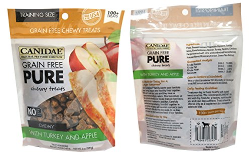 -. Feature : CANIDAE Grain Free PURE Chewy Treats for Dogs Training Size Variety Pack - 3 Flavors (Turkey & Apple, Rabbit & Kale, and Sweet Potato & Duck) / Grain Free, No corn, wheat, soy or fillers / Simple ingredients; ideal for sensitive dogs / Made in the USA / 3 Total Pouches (6 Ounces Each)