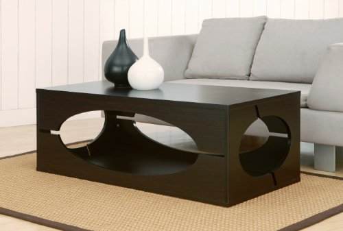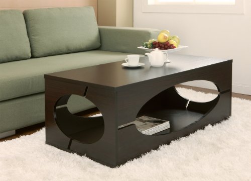 - Feature : A modern coffe table features a large open space storage compartment / Product is made of medium fiber board construction; laminate cappuccino finish / Modern style coffee table; intriguing and artful cut-out design; clean and modern design fits well in any livingroom spaces / Assembly required by two adults; To clean, use damp cotton cloth to wipe clean; Made in China / Measures 47-inch wide by 24-inch deep by 17-inch high; 30-days hassle-free replacement parts warranty