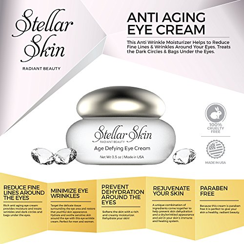 -. Binding : Misc. -. Brand : Stellar Skin -. EAN : 0700256534907 -. Feature : REDUCE FINE LINES AROUND THE EYES: Rich anti aging eye cream provides moisture and treats wrinkles and dark circles and bags under the eyes. / DEFY AGING WITH THIS MOSITURIZER CREME FOR THE EYES: Hydrate and soothe sensitive skin around the eye with the best eye wrinkle cream. Anti aging cream for men and women. / MINIMIZE EYE WRINKLES: Target the delicate tissue surrounding the eye area with these anti aging products. Restore that youthful skin appearance. / PREVENT DEHYDRATION AROUND THE EYES: Softens the skin with a rich and creamy moisturizer. Rehydrate your skin! / APPLY BEFORE MAKEUP: Can be used under concealer and foundation. -. IsAdultProduct : 0 -. Label : SRJ Group LLC -. Manufacturer : SRJ Group LLC -. MPN : SRJ Group LLC -. PartNumber : SRJ Group LLC -. ProductGroup : Beauty -. ProductTypeName : BEAUTY -. Publisher : SRJ Group LLC -. Studio : SRJ Group LLC -. Title : Best Anti Aging Eye Cream with Hyaluronic Acid from Stellar Skin, Anti Wrinkle Moisturizer, Reduce Fine Lines & Wrinkles Around Your Eyes, Skin Care Treats Dark Circles & Bags Under Eyes, Made in USA -. UPC : 700256534907
