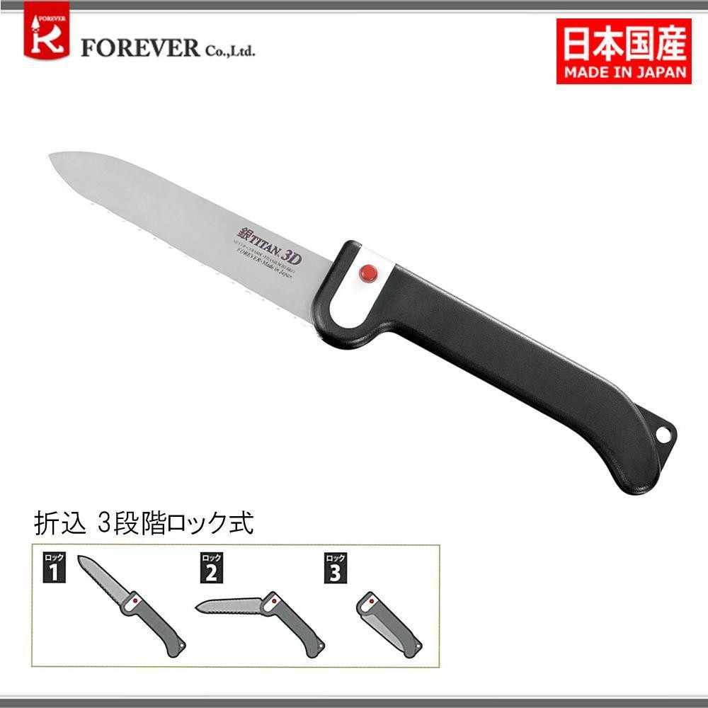折込収納可能なナイフです。抗菌刃なので衛生的! 製造国:日本 素材・材質:刃身:銀含有チタン合金把手:ABS樹脂 商品サイズ:290×40×17mm(折込収納時長さ:160mm)、刃渡り:140mm 重量:62g 仕様:刃形状:3D(波刃)・両刃3段階ロック式折込収納可食洗機使用不可 ※サプライヤー直送品 ご注文後3~4営業日後の出荷となります【商品名】フォーエバー 日本製 銀チタン3D 携行折込ナイフ 140mm 3D-TS14
