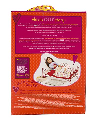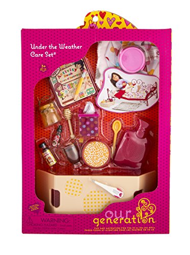 No one likes being sick at home, but everyone appreciates a good care-giver! Rest up and get back to feeling like yourself again with the Under the Weather Care Set! All Our Generation dolls, clothes, and accessories are made with safe, carefully-chosen, high-quality material. They are easy to clean and maintain, shipped in eco-friendly packaging, and can be collected and recycled the old fashioned way (by being passed on). At Our Generation we're dedicated to a new, multifaceted generation of girls who are playing hockey, getting involved in charities, dressing fashion-forward, and still finding time to, you know, be kids! Our Generation is much bigger than an 18" doll. It's about girls growing up together and creating the narrative of an extraordinary generation. Every time an Our Generation doll or accessory is purchased we donate 10 cents to the Free The Children's Power of a Girl Initiative, which is dedicated to addressing the unique challenges young girls face in accessing education, staying healthy, and overcoming poverty in developing countries. The Our Generation Under the Weather Care Set is fully compatible with most 18" dolls, including American Girl dolls and accessories. It includes 1 lap top tray, 1 spoon, 1 bowl with alphabet soup, 1 mug with tea, 1 honey jar, 1 honey stick, 1 cough syrup medicine , 1 ear drop medicine, 1 thermometer, 1 hot water bottle, 1 ice pack, 1 tissue box, 1 pencil, 1 activity book, 1 cuddly fleece blanket (please note: doll not included). From a good cause, for a good cause. Join the Generation.Feature