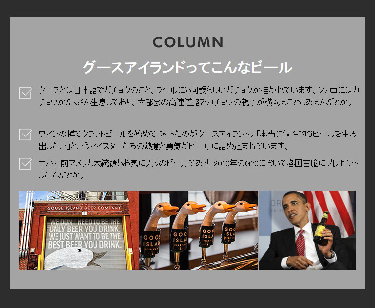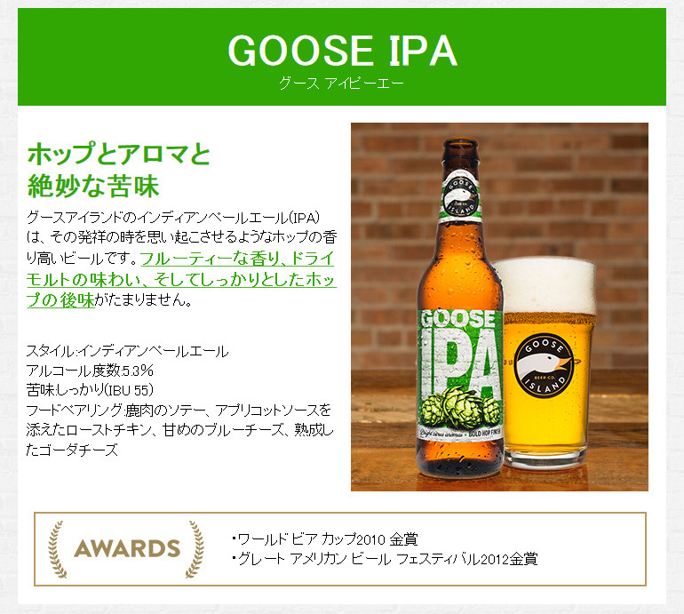 世界ではじめてワイン樽を使ったビール熟成を行ったブルワリー。グースアイランドのビールには「本当に個性的なビールを生み出したい」という熱意と勇気がつめこまれています。