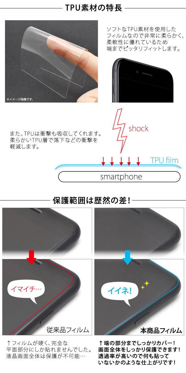 曲面部分まで背面の全面保護ができるソフトな素材のTPUフィルムです。