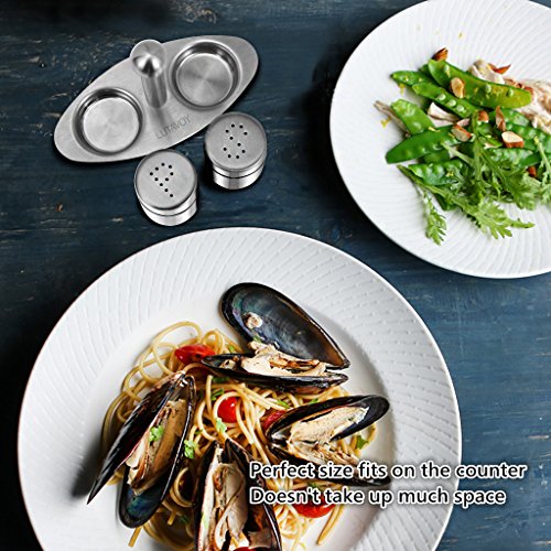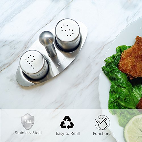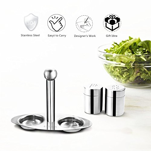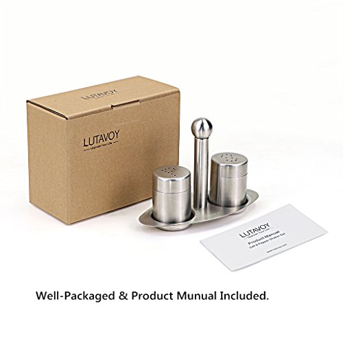 LUTAVOY LK01 Salt and Pepper Shaker Set with Matching Stand-Brushed Stainless Steel-Set of 3 Cruet Set