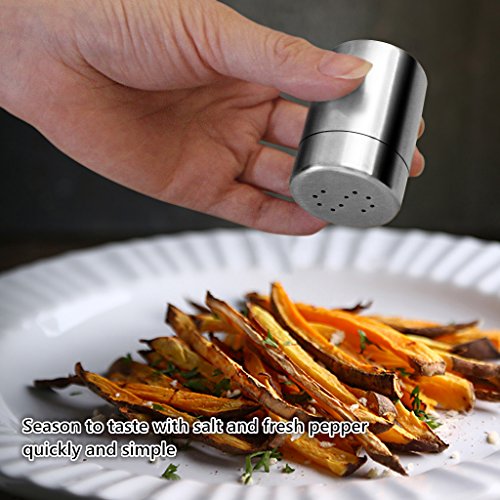 Sleek and Sturdy— Brushed stainless steel salt and pepper shakers compliments nicely in any kitchen with appliances in that type of covering. Beautiful addition that enhances any meal. *Salt and pepper not included