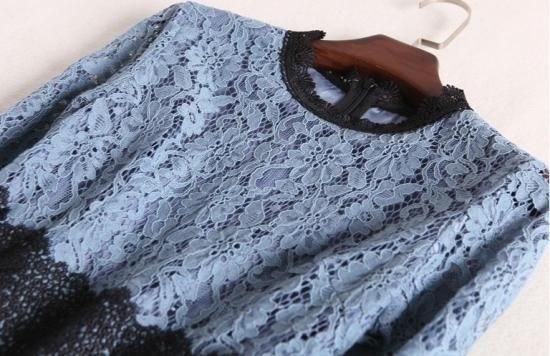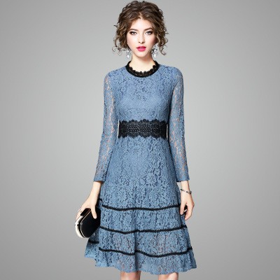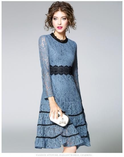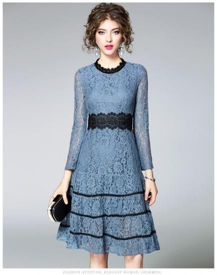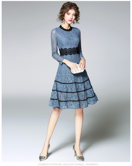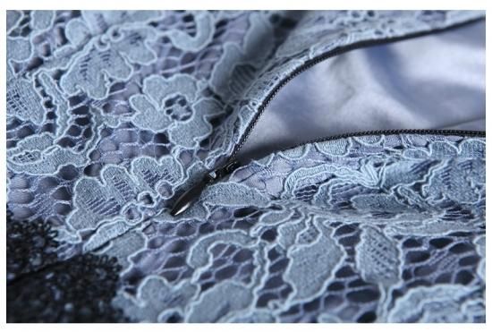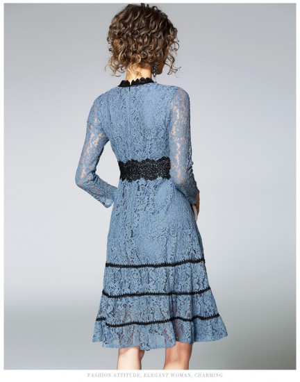 パーティードレス ひざ丈 ワンピース 花柄レース ブルー 透け感 シースルー プチハイネック 大人 上品 お呼ばれ ディナー drgz2325