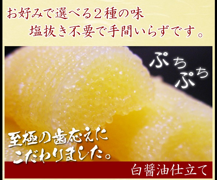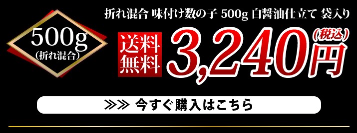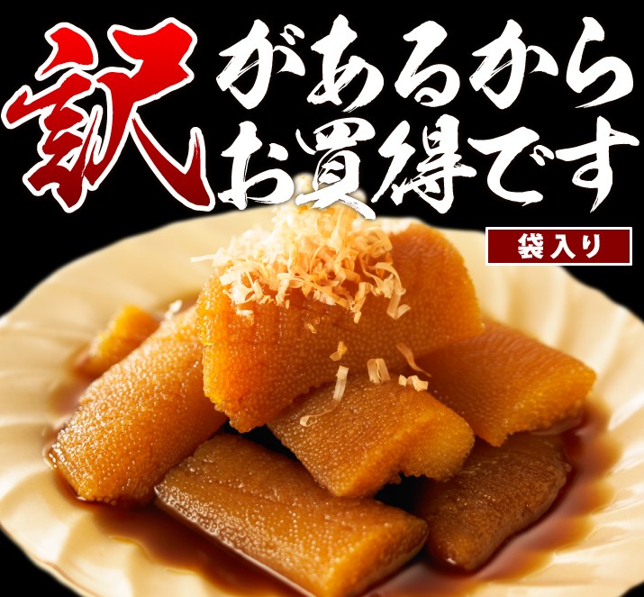 | 商品内容 | ■名称:魚卵加工品 味付け数の子(2折れ、3折れ混合)白醤油仕立て ■内容量:固形量1kg(500g×2) ■原材料:数の子(ロシア産)、砂糖、みりん、食塩、醤油、蛋白加水分解物、鰹節、鰹節エキス、昆布エキス、調味料(アミノ酸等)、ph調整剤、グリシン、保存料(ポリリジン)、(原材料に一部に小麦、大豆を含む) ■加工地:北海道(岩内) |